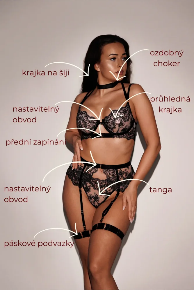Tento exkluzivní třídílný podvazkový komplet spojuje nádhernou průsvitnou krajku, netradiční střih a smyslné detaily, které podtrhnou vaši krásu a dokonalost.